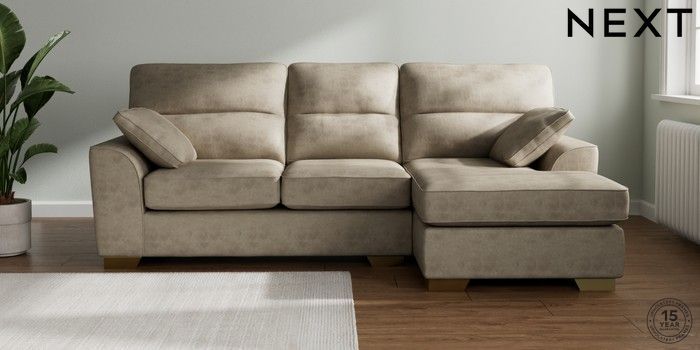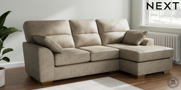 7.3.1 Buy Stamford Highback Medium Sofa Chaise - Right Hand Monza Faux Leather Easy Clean Mink Brown Large Square Angle - Brushed Brass from the Next UK online shop Click here to use our accessible website