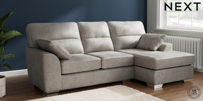 6.12.1 Buy Stamford Highback Medium Sofa Chaise - Right Hand Plush Chenille Light Grey Large Square Angle - Chrome Metal from the Next UK online shop Click here to use our accessible website