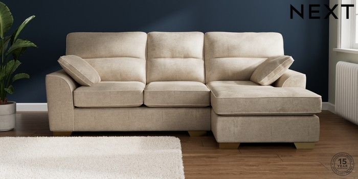 7.2.10 Buy Stamford Highback Medium Sofa Chaise - Right Hand Plush Chenille Light Natural Large Square Angle - Brushed Brass from the Next UK online shop Click here to use our accessible website