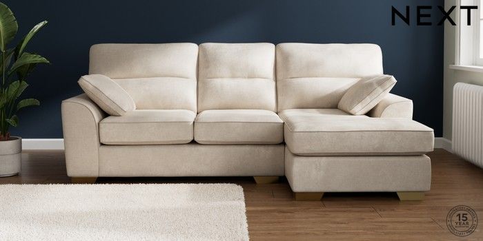 7.2.10 Buy Stamford Highback Medium Sofa Chaise - Right Hand Plush Chenille Oyster Large Square Angle - Brushed Brass from the Next UK online shop Click here to use our accessible website