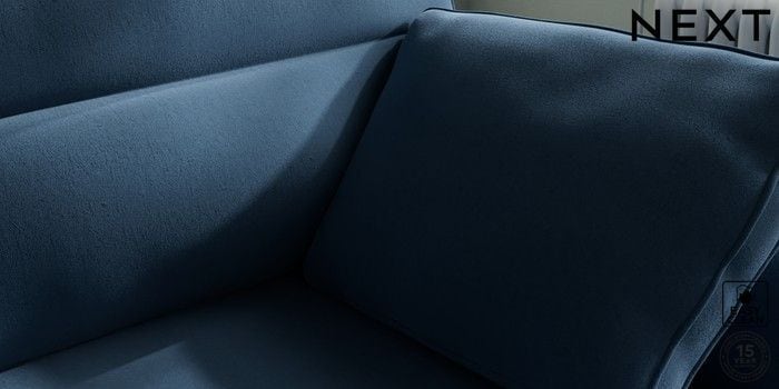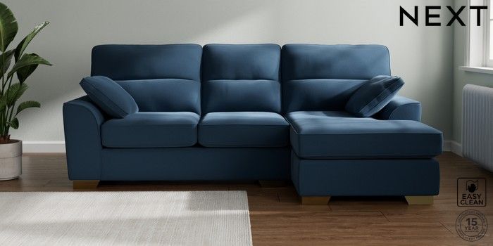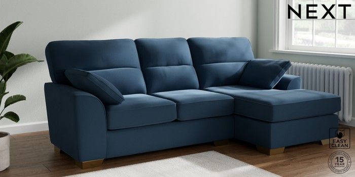 7.2.10 Buy Stamford Highback Medium Sofa Chaise - Right Hand Plush Velvet Easy Clean Airforce Blue Large Square Angle - Brushed Brass from the Next UK online shop Click here to use our accessible website