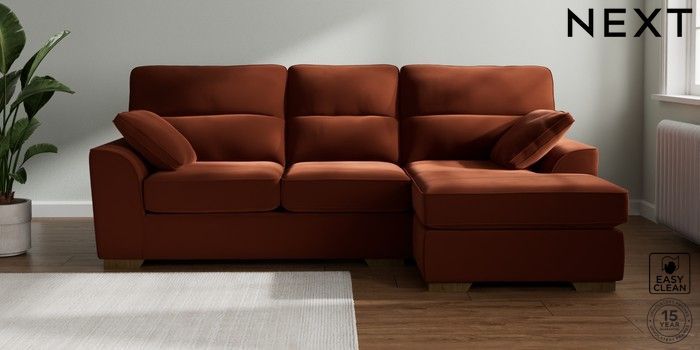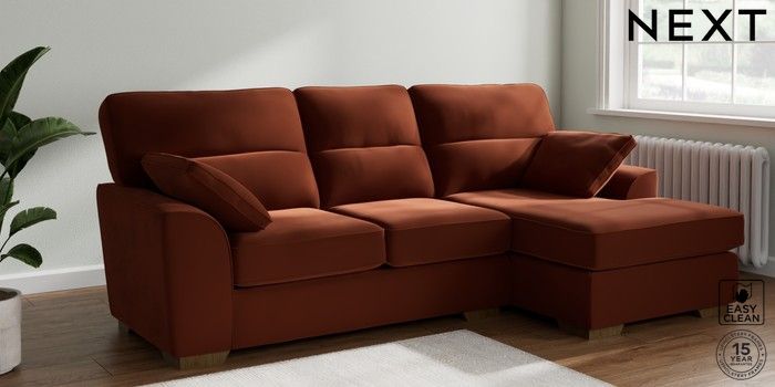 7.2.10 Buy Stamford Highback Medium Sofa Chaise - Right Hand Plush Velvet Easy Clean Ginger Orange Large Square Angle - Mid from the Next UK online shop Click here to use our accessible website
