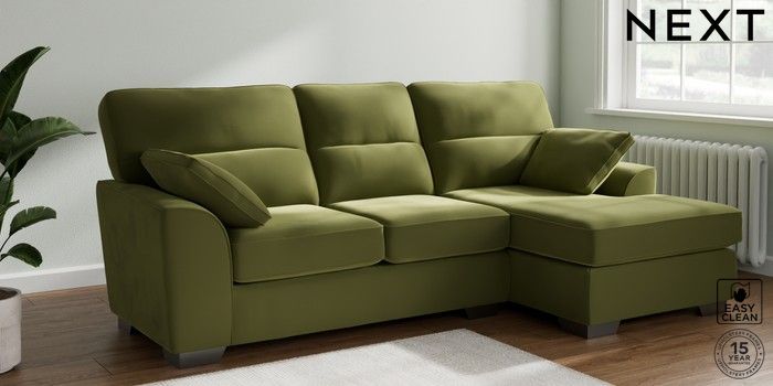 7.3.1 Buy Stamford Highback Medium Sofa Chaise - Right Hand Plush Velvet Easy Clean Mid Olive Green Large Square Angle - Gunmetal from the Next UK online shop Click here to use our accessible website