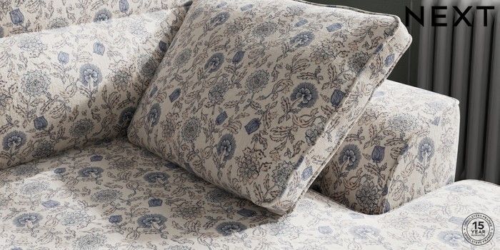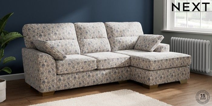7.3.1 Buy Stamford Highback Medium Sofa Chaise - Right Hand Relaxed Linen Look Print Woodblock Floral Blue Large Square Angle - Brushed Brass from the Next UK online shop Click here to use our accessible website