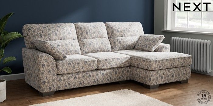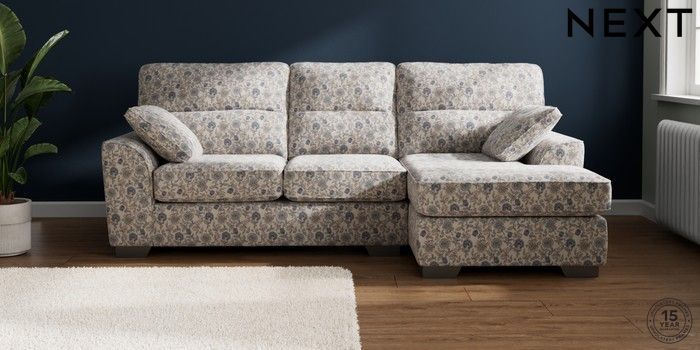 7.3.1 Buy Stamford Highback Medium Sofa Chaise - Right Hand Relaxed Linen Look Print Woodblock Floral Blue Large Square Angle - Gunmetal from the Next UK online shop Click here to use our accessible website