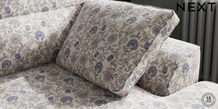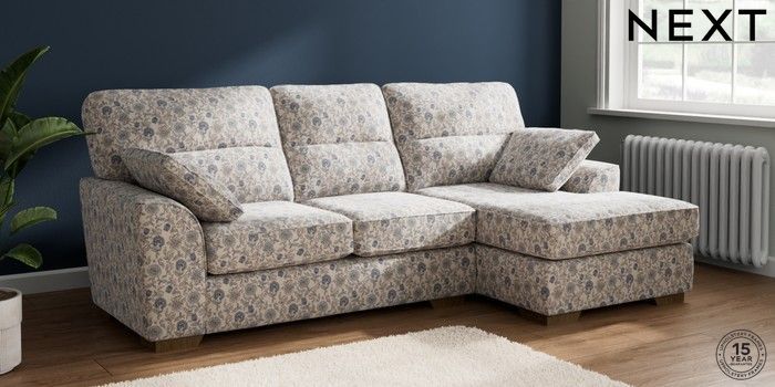 7.3.1 Buy Stamford Highback Medium Sofa Chaise - Right Hand Relaxed Linen Look Print Woodblock Floral Blue Large Square Angle - Mid from the Next UK online shop Click here to use our accessible website