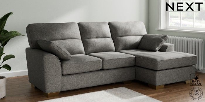 7.2.10 Buy Stamford Highback Medium Sofa Chaise - Right Hand Tweedy Blend Easy Clean Dark Grey Large Square Angle - Brushed Brass from the Next UK online shop Click here to use our accessible website