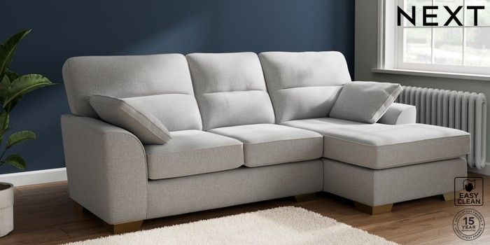 7.2.6 Buy Stamford Highback Medium Sofa Chaise - Right Hand Tweedy Blend Easy Clean Light Silver Grey Large Square Angle - Brushed Brass from the Next UK online shop Click here to use our accessible website