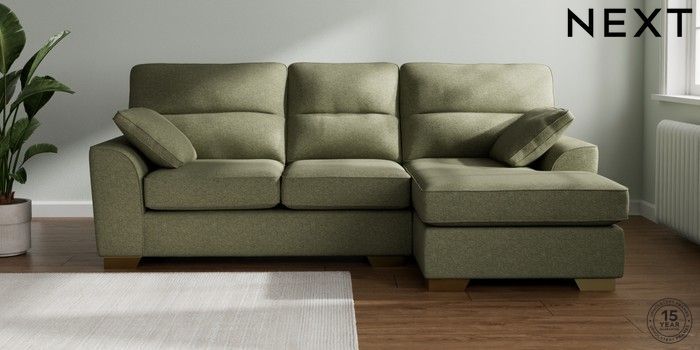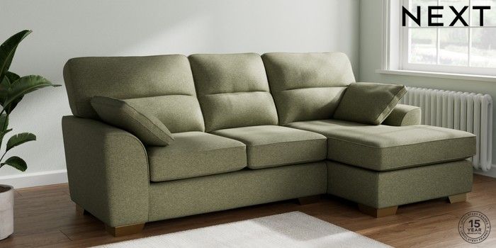 7.2.10 Buy Stamford Highback Medium Sofa Chaise - Right Hand Tweedy Chenille Mid Moss Green Large Square Angle - Brushed Brass from the Next UK online shop Click here to use our accessible website