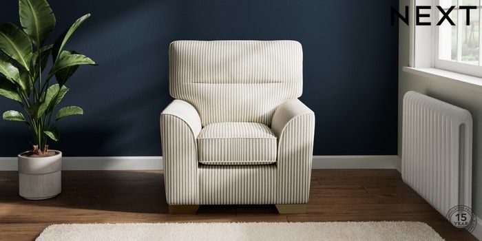 7.3.1 Buy Stamford Highback Small Armchair Chenille Stripe Moss Green Square Angle - Brushed Brass from the Next UK online shop Click here to use our accessible website