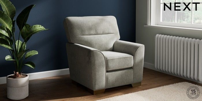 6.12.1 Buy Stamford Highback Small Armchair Chunky Chenille Light Grey Square Angle - Brushed Brass from the Next UK online shop Click here to use our accessible website