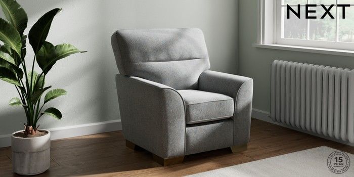 6.12.1 Buy Stamford Highback Small Armchair Chunky Marl Mid Grey Square Angle - Brushed Brass from the Next UK online shop Click here to use our accessible website