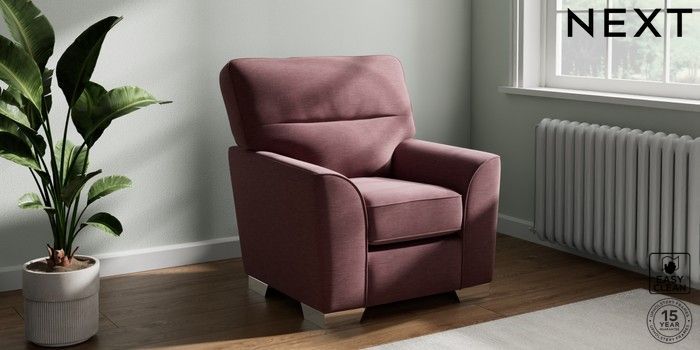 6.12.13 Buy Stamford Highback Small Armchair Fine Chenille Easy Clean Mid Mulberry Purple Square Angle - Chrome Metal from the Next UK online shop Click here to use our accessible website