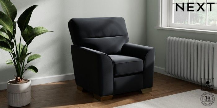 6.12.1 Buy Stamford Highback Small Armchair Plush Velvet Easy Clean Charcoal Grey Square Angle - Brushed Brass from the Next UK online shop Click here to use our accessible website