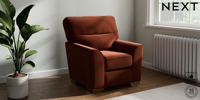 6.12.1 Buy Stamford Highback Small Armchair Plush Velvet Easy Clean Ginger Orange Square Angle - Brushed Brass from the Next UK online shop Click here to use our accessible website