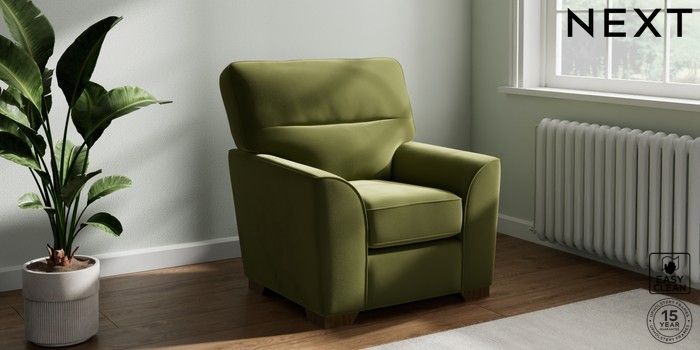 6.12.1 Buy Stamford Highback Small Armchair Plush Velvet Easy Clean Mid Olive Green Square Angle - Mid from the Next UK online shop Click here to use our accessible website