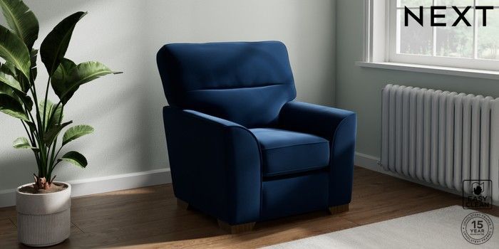 6.12.1 Buy Stamford Highback Small Armchair Plush Velvet Easy Clean Navy Blue Square Angle - Mid from the Next UK online shop Click here to use our accessible website