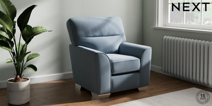6.12.1 Buy Stamford Highback Small Armchair Relaxed Linen Look Mid Blue Square Angle - Chrome Metal from the Next UK online shop Click here to use our accessible website