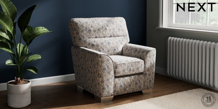 7.3.1 Buy Stamford Highback Small Armchair Relaxed Linen Look Print Woodblock Floral Blue Square Angle - Chrome Metal from the Next UK online shop
