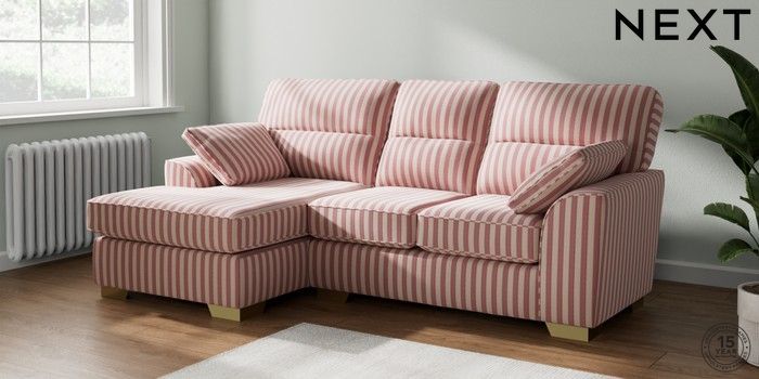 7.3.1 Buy Stamford Highback Small Sofa Chaise - Left Hand Bold Chenille Stripe Dark Pink Large Square Angle - Brushed Brass from the Next UK online shop Click here to use our accessible website