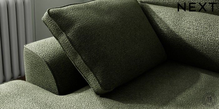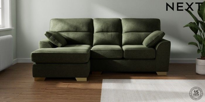 7.2.10 Buy Stamford Highback Small Sofa Chaise - Left Hand Boucle Chenille Dark Moss Green Large Square Angle - Brushed Brass from the Next UK online shop Click here to use our accessible website