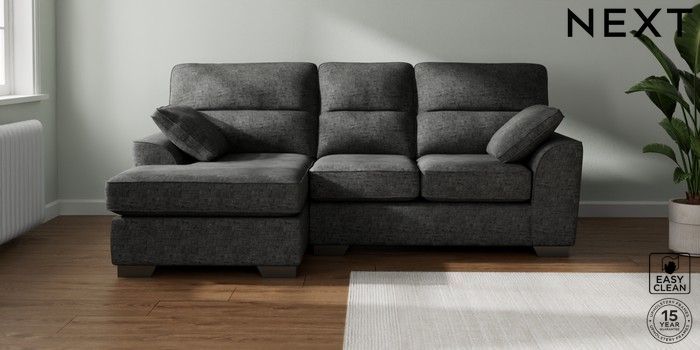 7.2.10 Buy Stamford Highback Small Sofa Chaise - Left Hand Boucle Weave Easy Clean Charcoal Grey Large Square Angle - Gunmetal from the Next UK online shop Click here to use our accessible website