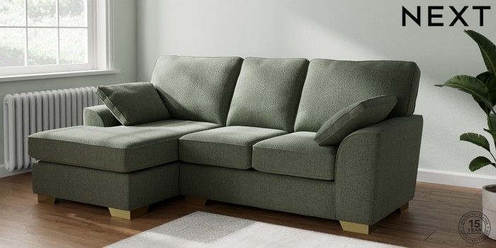 6.12.13 Buy Stamford Highback Small Sofa Chaise - Left Hand Chunky Texture Mid Forest Green Large Square Angle - Brushed Brass from the Next UK online shop Click here to use our accessible website