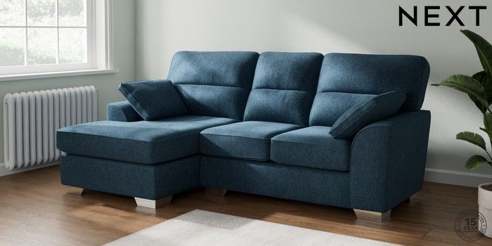 7.2.10 Buy Stamford Highback Small Sofa Chaise - Left Hand Cotswold Chenille Dark Blue Large Square Angle - Chrome Metal from the Next UK online shop Click here to use our accessible website