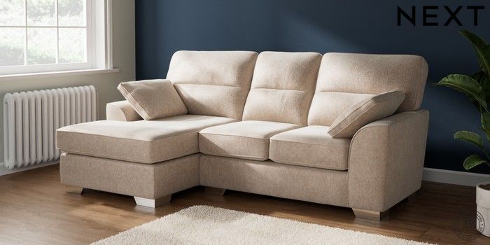 7.2.10 Buy Stamford Highback Small Sofa Chaise - Left Hand Cotswold Chenille Light Natural Large Square Angle - Chrome Metal from the Next UK online shop Click here to use our accessible website