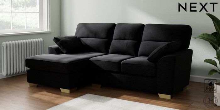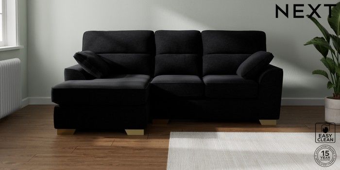 7.2.10 Buy Stamford Highback Small Sofa Chaise - Left Hand Fine Chenille Easy Clean Black Large Square Angle - Brushed Brass from the Next UK online shop Click here to use our accessible website