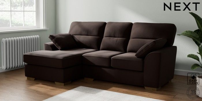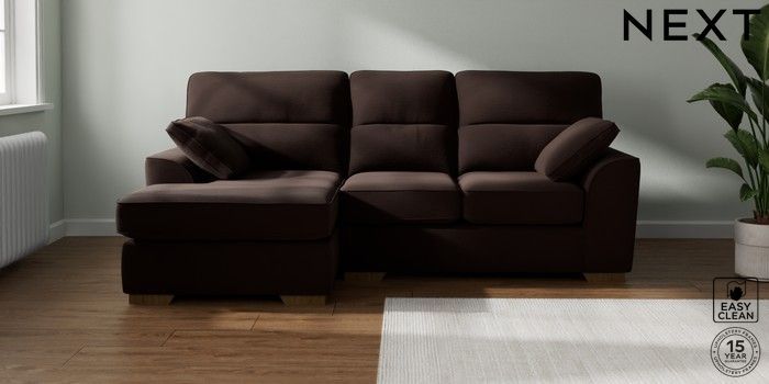 7.2.10 Buy Stamford Highback Small Sofa Chaise - Left Hand Fine Chenille Easy Clean Chocolate Brown Large Square Angle - Mid from the Next UK online shop Click here to use our accessible website