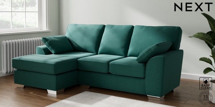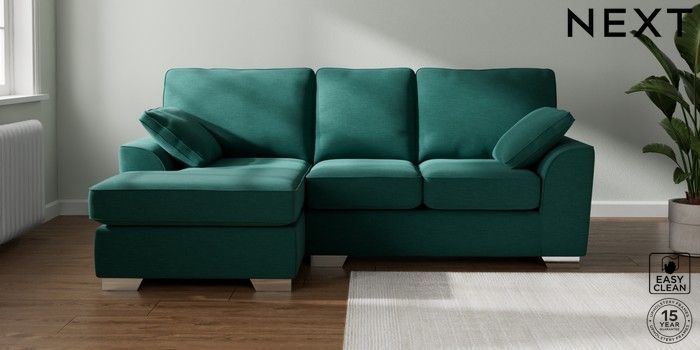 7.2.10 Buy Stamford Highback Small Sofa Chaise - Left Hand Fine Chenille Easy Clean Dark Juniper Green Large Square Angle - Chrome Metal from the Next UK online shop Click here to use our accessible website