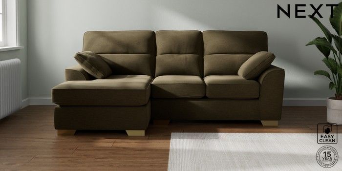 7.2.10 Buy Stamford Highback Small Sofa Chaise - Left Hand Fine Chenille Easy Clean Dark Moss Green Large Square Angle - Brushed Brass from the Next UK online shop Click here to use our accessible website