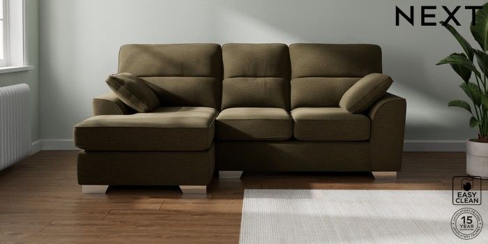 7.3.1 Buy Stamford Highback Small Sofa Chaise - Left Hand Fine Chenille Easy Clean Dark Moss Green Large Square Angle - Chrome Metal from the Next UK online shop Click here to use our accessible website