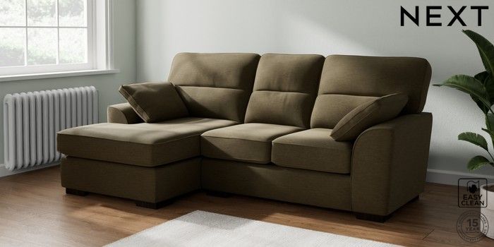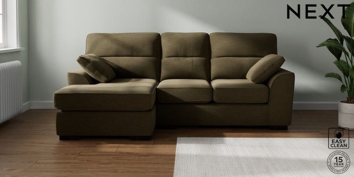 7.2.10 Buy Stamford Highback Small Sofa Chaise - Left Hand Fine Chenille Easy Clean Dark Moss Green Large Square Angle - Dark from the Next UK online shop Click here to use our accessible website