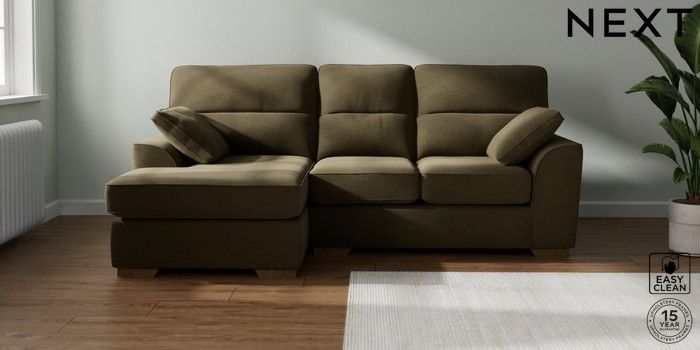 7.2.10 Buy Stamford Highback Small Sofa Chaise - Left Hand Fine Chenille Easy Clean Dark Moss Green Large Square Angle - Mid from the Next UK online shop Click here to use our accessible website