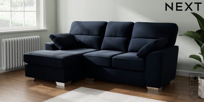 7.3.1 Buy Stamford Highback Small Sofa Chaise - Left Hand Fine Chenille Easy Clean Dark Navy Blue Large Square Angle - Chrome Metal from the Next UK online shop Click here to use our accessible website
