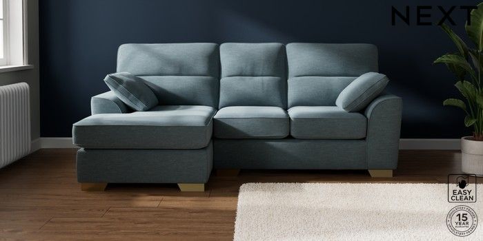 7.2.10 Buy Stamford Highback Small Sofa Chaise - Left Hand Fine Chenille Easy Clean Mid Blue Large Square Angle - Brushed Brass from the Next UK online shop Click here to use our accessible website