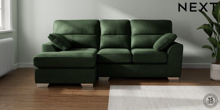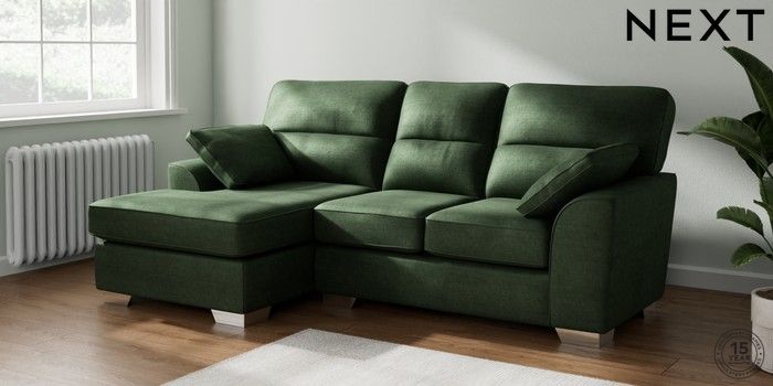 7.2.10 Buy Stamford Highback Small Sofa Chaise - Left Hand Luxe Chenille Dark Green Large Square Angle - Chrome Metal from the Next UK online shop Click here to use our accessible website