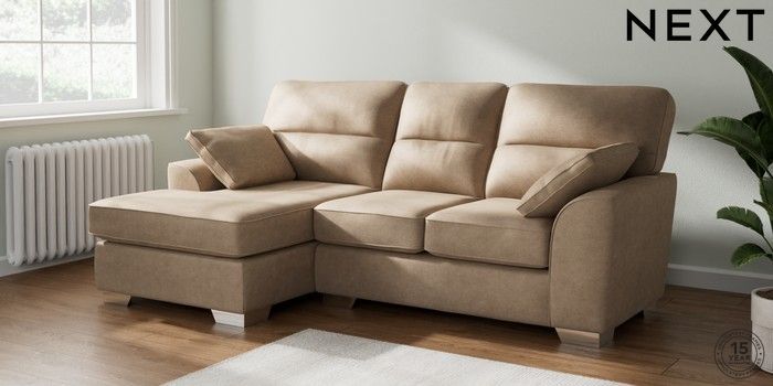 7.2.10 Buy Stamford Highback Small Sofa Chaise - Left Hand Luxe Chenille Mid Camel Beige Large Square Angle - Chrome Metal from the Next UK online shop Click here to use our accessible website