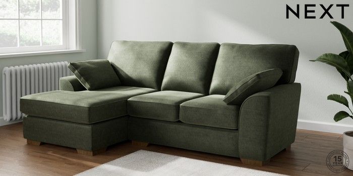 6.12.1 Buy Stamford Highback Small Sofa Chaise - Left Hand Luxe Chenille Mid Green Large Square Angle - Mid from the Next UK online shop Click here to use our accessible website