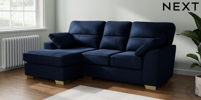 7.2.10 Buy Stamford Highback Small Sofa Chaise - Left Hand Luxe Chenille Navy Blue Large Square Angle - Brushed Brass from the Next UK online shop Click here to use our accessible website
