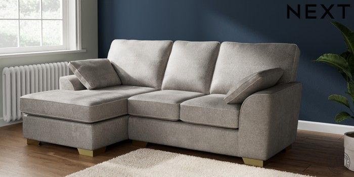 6.12.1 Buy Stamford Highback Small Sofa Chaise - Left Hand Plush Chenille Light Grey Large Square Angle - Brushed Brass from the Next UK online shop Click here to use our accessible website