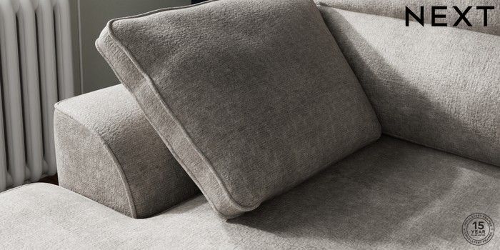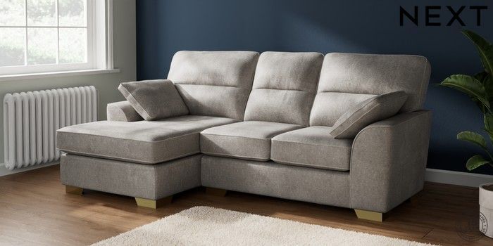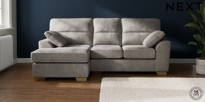 7.2.10 Buy Stamford Highback Small Sofa Chaise - Left Hand Plush Chenille Light Grey Large Square Angle - Brushed Brass from the Next UK online shop Click here to use our accessible website