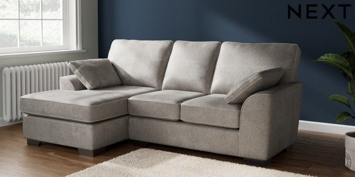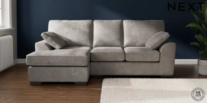 7.2.10 Buy Stamford Highback Small Sofa Chaise - Left Hand Plush Chenille Light Grey Large Square Angle - Gunmetal from the Next UK online shop Click here to use our accessible website