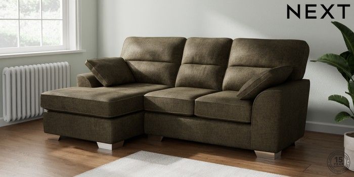 7.2.10 Buy Stamford Highback Small Sofa Chaise - Left Hand Plush Chenille Moss Green Large Square Angle - Chrome Metal from the Next UK online shop Click here to use our accessible website