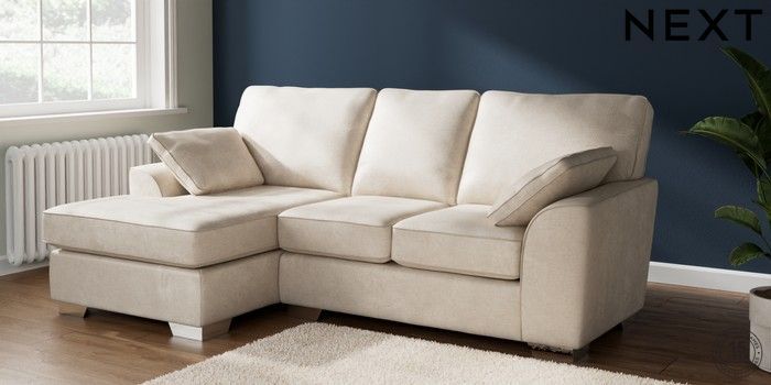 6.12.1 Buy Stamford Highback Small Sofa Chaise - Left Hand Plush Chenille Oyster Large Square Angle - Chrome Metal from the Next UK online shop Click here to use our accessible website