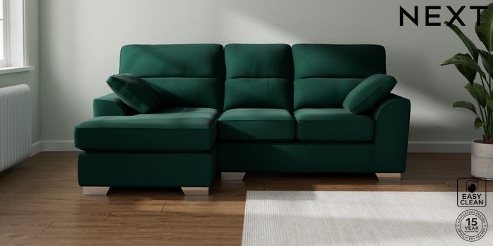 7.3.1 Buy Stamford Highback Small Sofa Chaise - Left Hand Plush Velvet Easy Clean Bottle Green Large Square Angle - Chrome Metal from the Next UK online shop Click here to use our accessible website