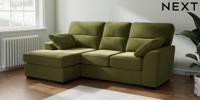 7.3.1 Buy Stamford Highback Small Sofa Chaise - Left Hand Plush Velvet Easy Clean Mid Olive Green Large Square Angle - Dark from the Next UK online shop Click here to use our accessible website