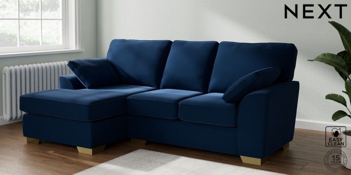 6.12.1 Buy Stamford Highback Small Sofa Chaise - Left Hand Plush Velvet Easy Clean Navy Blue Large Square Angle - Brushed Brass from the Next UK online shop Click here to use our accessible website